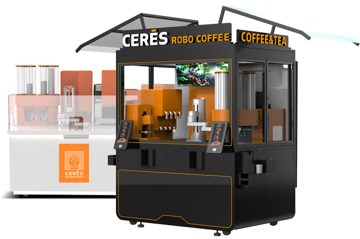 Robot CERĒS is an 24/7 fully autonomous robotic coffee kiosk that uses advanced robotic technology and a smart operating system to seamlessly prepare customized barista grade high quality coffee and tea beverages.